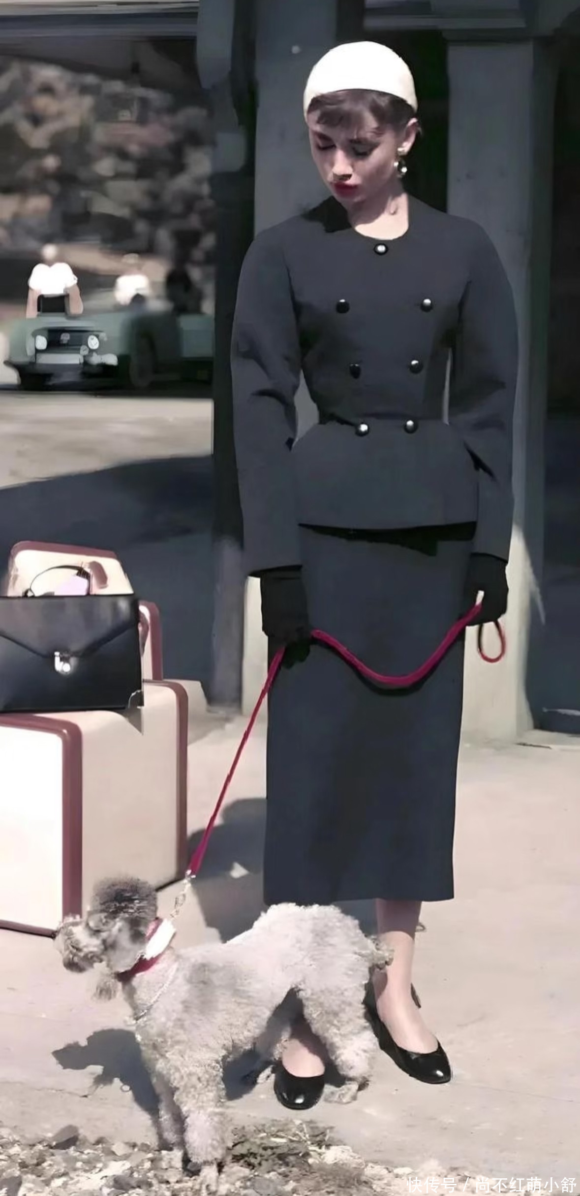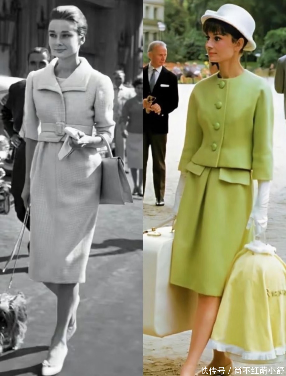 来望望她的绿色套装,十分衬出她清丽脱俗的气质,极度合乎赫本这么骨架纤细的女性。她常运用收腰忖度打算与称身剪裁,即使穿着外衣也不掩身姿弧线。