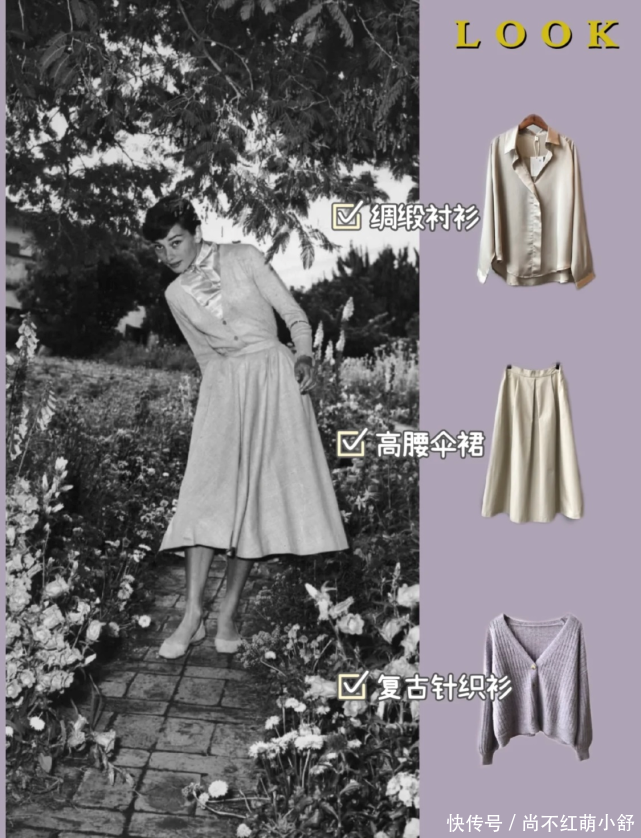 穿搭示范2:赫本这套暖色配色打扮也爱了。一件质感上乘的绸缎衬衫,泛着柔软色泽,自带高档感。搭配高腰伞裙,神秘进步腰线,突显纤细腰肢,尽显优雅炫夸。外搭一件守旧诚笃衫,眨眼间增添温婉氛围,三种单品碰撞,打造出守旧又斯文的特别气魄,魔力完全。