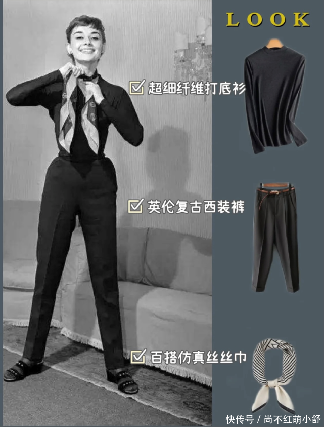 穿搭示范1:赫本那套经典的灰色系列配色,一件高领打底衫检朴优雅,勾画出颈部柔好意思线条;利落的西装裤干练大气,尽显超逸风韵。一条真丝丝巾微小点缀,为全体增添灵动与细巧,于低调中彰显非凡试吃,将优雅气质展现得大书特书。